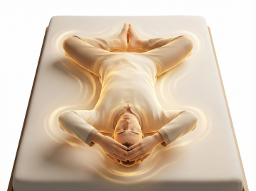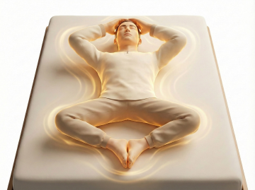 一张温馨的卧室场景,中央是一张铺着棕色床垫的床,床垫表面柔软舒适,带有自然的纹理。阳光透过窗户洒在床垫上,形成温暖的光斑。床头柜上摆放着一盏柔和的台灯和一盆绿色植物,整体色调温暖柔和,营造出舒适、放松的居家氛围。