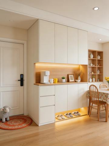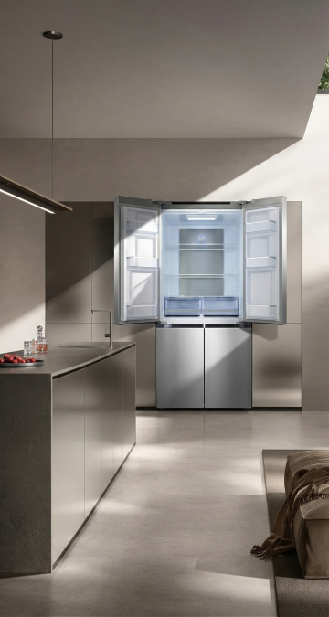 极简主义风格的白色双门冰箱位于画面中央,保持其原有形态与设计细节。冰箱周围环境改为温馨明亮的北欧风厨房一角,浅灰色木纹地板延伸至墙面,墙面采用柔和的米白色。冰箱右侧是原木色一字型橱柜,台面整洁,摆放着透明玻璃罐,内装杂粮与意面。橱柜上方悬挂着简约白色搁板,放置几只白色陶瓷碗碟。左侧靠近冰箱处有一盆大型龟背竹绿植,叶片舒展自然。画面左下角放置一把金色金属框架的餐椅,搭配浅灰色布艺坐垫。整体采用自然光线下的柔和光影,色调清新明快,营造出简约舒适的居家氛围,构图保持对称平衡,视觉焦点集中于冰箱主体,细节丰富且具有生活气息。