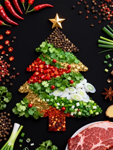 复古圣诞树造型拼贴,绿丝带勾勒轮廓,搭配双色设计彩妆与浮世绘风元素,轻拟物风呈现喜庆节日氛围,时尚感十足。