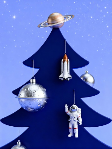 拼贴风圣诞树造型,以丝带与彩妆构建节日构图,融合轻拟物与面料质感,营造喜庆温馨的时尚氛围。
