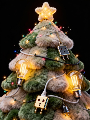 3D重拟物风格圣诞树,毛发生长质感搭配金属插头与灯泡,暖光闪烁,融合喜庆、温馨与趣味,科技感十足的节日创意。
