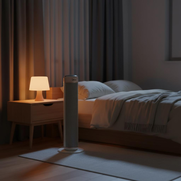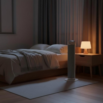 暖光轻雾萦绕,木雕风床头柜上简约加湿器静置,柔光透帘,营造冬日温馨实景感,轻拟物设计呼应自然舒适。