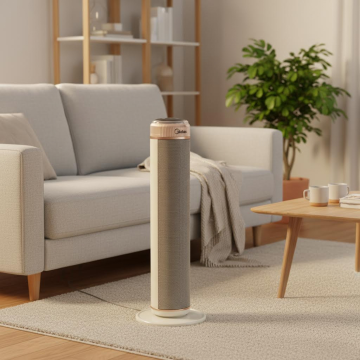 现代简约风格,舒适客厅场景,风扇设计流畅,营造温馨氛围。