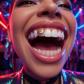 充分参考图片中 925 银饰品 素材,借鉴饰品与牙模中牙齿的关系,生成3个场景图: 场景1: 顾客在诊室 粘接好 原图中牙齿饰品的 快乐微笑。