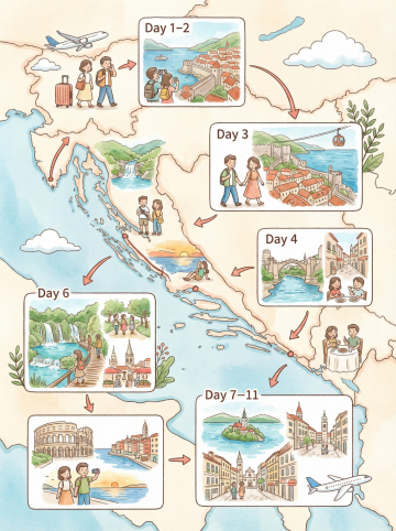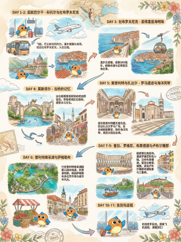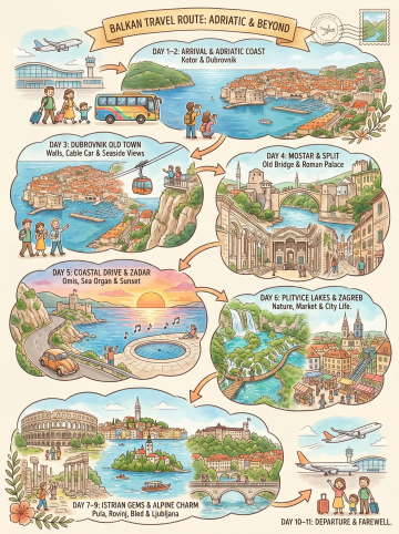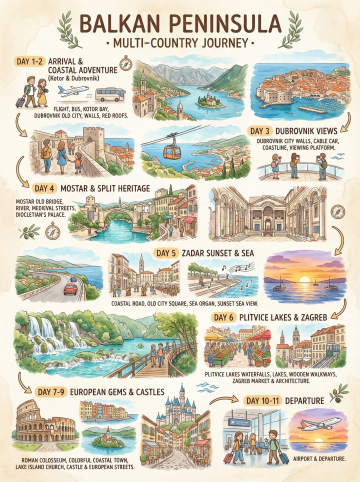 生成一幅手绘旅行行程信息插画风格的作品(尺寸 3:4),竖版信息图排版,整体分为 6 个行程区块,以弯曲箭头串联时间顺序,清楚呈现巴尔干半岛多国旅行路线。