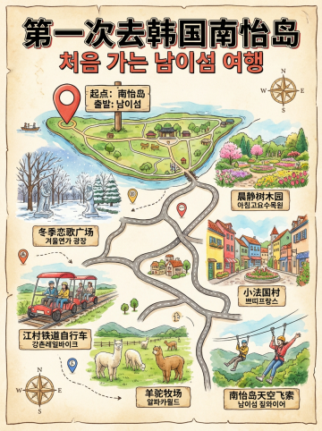 所有行程标题与说明文字必须为清晰、精准的中文字体,与插画自然融合。