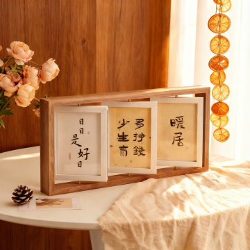 把图中的相册换一个摆放方式,场景在客厅的桌子上,有几张动物图片