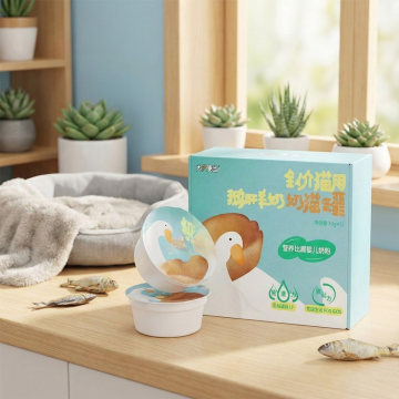 扁平风与轻拟物结合,猫与猫粮袋置于纸箱中,实景感强,清新质朴,传递自然舒适与可爱氛围,节日无特定主题。