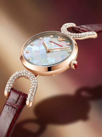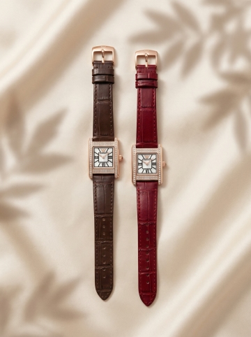 奢华感与优雅感交织,金属风表壳搭配皮质风表带,重拟物风礼盒呈现真实质感,浮雕风细节凸显精致工艺,节日氛围浓厚。