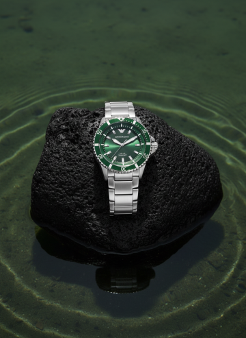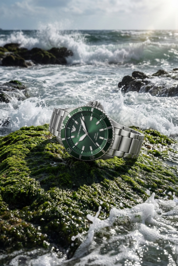 现代感与科技感融合的商务腕表,采用双色设计风与几何风,金属风表壳搭配浮雕风细节,绿色表带彰显时尚潮流与优雅气质。
