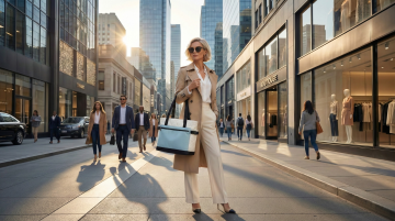 一位女性迎着晨光,轻松自信地走在城市街道上