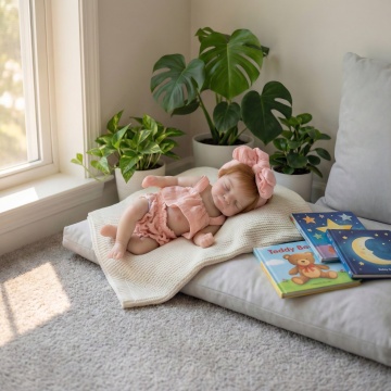 极简主义风格的儿童卧室,温暖柔和的原木色与米白色为主色调,自然光从侧面窗户洒落形成柔和的光影效果,细腻的木质纹理与编织质感的地毯和收纳篮,浅米色墙壁上挂着装饰画,不同形态和布置的木质家具(如带抽屉的储物柜、简约单人床),地面散落着不同尺寸的毛绒玩具熊,整体营造出温馨舒适、简约自然的氛围,干净整洁的空间布局,柔和的光线带来宁静惬意的感觉,不同布置的背景中保持原木色系与编织元素的统一风格。