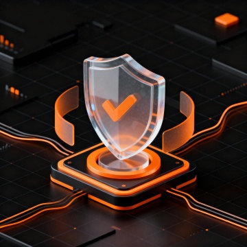 未来感3D玻璃盾牌,霓虹橙光勾勒科技线条,金属质感基座,光影交错展现安全防护主题。
