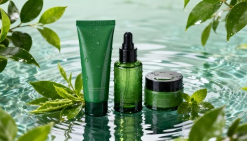 高清晰3D渲染的护肤品展示图,白色纯净背景,五款不同样式和类型的护肤品整齐排列,从左到右依次为:高瘦圆柱形透明蓝色玻璃喷雾瓶配银色按压泵头、中等高度圆柱形半透明渐变蓝玻璃喷雾瓶配银色金属盖、矮胖梨形透明蓝色玻璃喷雾瓶配银色按压泵、小巧圆柱形透明玻璃喷雾瓶配银色泵头、以及矮圆罐状透明玻璃面霜瓶配银色螺旋盖。所有瓶身具有光滑细腻的玻璃质感,内部液体呈现清澈的淡蓝色或透明色,瓶盖和泵头为高反光金属材质,带有细腻的光影反射和高光点。整体画面采用柔和的顶部光源,在瓶身底部形成轻微的阴影,增强立体感,构图对称平衡,视觉层级清晰,突出产品的高端质感和纯净简约的设计风格,信息传达直接高效,符合护肤品广告的目标受众审美。