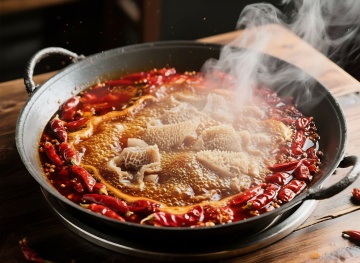 重拟物风呈现热辣沸腾的中式火锅,油光溢彩,蒸汽缭绕,辣椒与牛肚在光影中跃动,质朴木桌衬托实景感,如油画般浓郁。