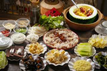 热气腾腾的鸳鸯火锅冒着浓郁香气,锅中翻滚着鲜红的麻辣汤底和清亮的菌汤,周围摆满肥牛卷、虾滑、毛肚、青菜等各色食材,木质餐桌上铺着传统花纹餐布,背景是古色古香的中式屏风和红灯笼,营造出温馨热闹的火锅盛宴氛围,整体呈现出温暖诱人的色调和丰富的层次感,充满地道的中式火锅文化气息。