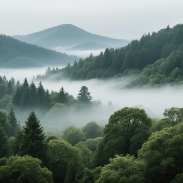 一片幽深静谧的森林露营地,中央矗立着一座深绿色的尖顶帐篷,帐篷前铺着棕色野餐垫,上面摆放着木质餐盘、玻璃水壶和点燃的马灯。四周高大的杉树环绕,地面覆盖着厚厚的松针和苔藓,散落着几颗松果和野生蘑菇。远处透过树林缝隙可见朦胧的月亮和点点星光,帐篷旁悬挂着一串暖色小灯,空气中弥漫着淡淡的松木香和泥土气息,整体呈现出暗调森林系的复古露营氛围。