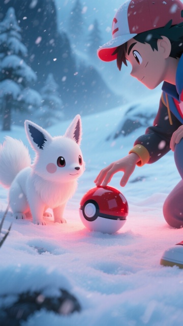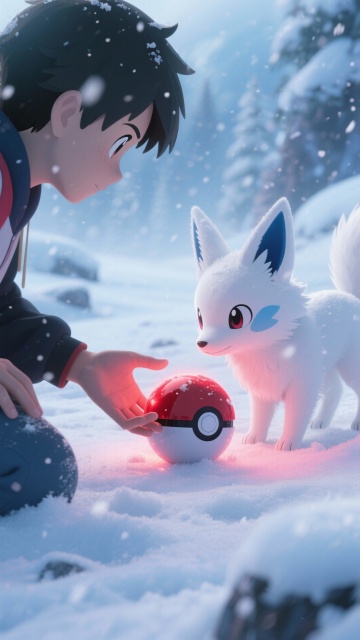 暴风雪中,训练家伸出手,轻柔地将精灵球放在雪地上,一只白色狐狸类宝可梦好奇靠近,红光温柔升起将其包裹,没有挣扎,只有信任的眼神交汇,冷色调中透出暖光,新海诚式细腻画风,强调情感与羁绊。