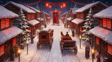 雪夜古街,红灯高挂,人物穿梭于暖光与积雪之间,融合中式古典与节日喜庆,厚涂插画风营造温馨故事感,光影交错,体积饱满,宛如微缩浮世绘画卷。