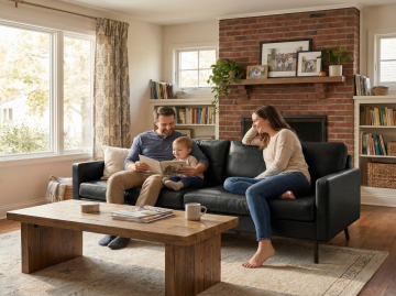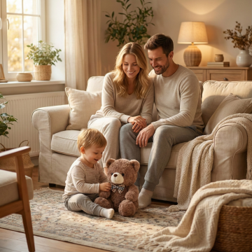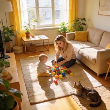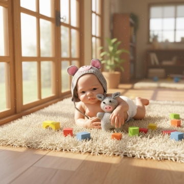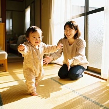 暖阳洒落的榻榻米空间,母子互动洋溢温馨与舒适。轻拟物风毛绒面料质感,柔和色调勾勒东亚家居美学,实景感捕捉生活瞬间的细腻温度。