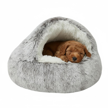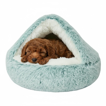 这是一个比较小的小狗窝,帮我生成一张图片。要求是小柯基在使用的场景图,不能出现文字。小狗窝后有小猫趴着观看的场景