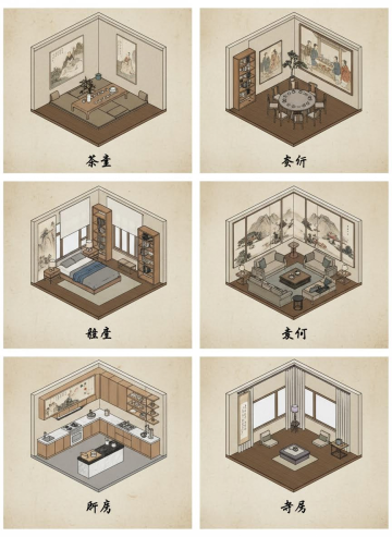 系列集合包含四个不同元素内容的插画,每个插画均为Q版卡通风格的建筑,保持相同的半侧面视角、等距透视和精致细节,整体排布规整对称;第一个建筑为日式町屋,深棕色木构搭配灰黑色瓦顶,点缀红色灯笼与绿色植物,纯色浅米色背景;第二个建筑为中东城堡,土黄色墙体配蓝色穹顶与尖拱窗,装饰几何纹样与彩色玻璃,纯色浅橙色背景;第三个建筑为东南亚高脚屋,棕褐色竹木结构配棕榈叶屋顶,悬挂藤编灯饰与织物,纯色浅绿色背景;第四个建筑为北欧木屋,白色墙体配深灰色坡顶,装饰驯鹿雕塑与雪花纹样,纯色浅蓝色背景;所有建筑均具有类似的体积感、圆角处理和生活化细节(如门前陈设、植物装饰),保持统一的光影效果(柔和顶光、轻微阴影)和材质表现(木质纹理、砖石质感),整体风格统一且色彩协调。