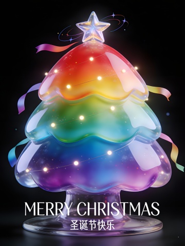 晶莹剔透的玻璃风圣诞树,融合3D几何结构与粒子光效,闪耀梦幻光影,未来感十足,搭配绚丽烟花,营造奢华节日氛围。