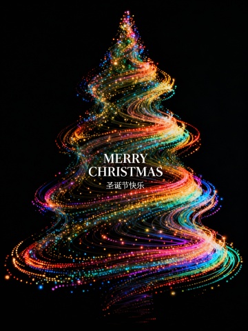 鎏金粒子缠绕成梦幻圣诞树,3D光影流动,闪耀星芒,尽显奢华浪漫与温馨唯美感。