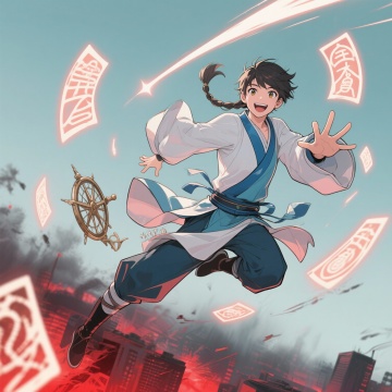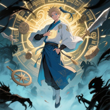Anime key visual, ultimate cool pose, “Satoru Gojo”-style confident demeanor. A handsome young male Taoist priest with a high ponytail, in stylish modified blue and white robes, is suspended mid-air in a relaxed, dominant pose. One hand is casually in his pocket, the other forms a glowing golden Taoist seal in front of his chest. He has a wild, smirk on his face, looking down with half-lidded, piercing blue eyes directly at the viewer. Behind him, a magnificent golden light erupts like a domain, filled with swirling talismans and ancient floating instruments (Luo Pan, sword), pushing back a dense, eerie fog filled with monstrous silhouettes. Low angle view, dynamic composition, vibrant colors, stark contrast, ultra-detailed, trending on ArtStation.