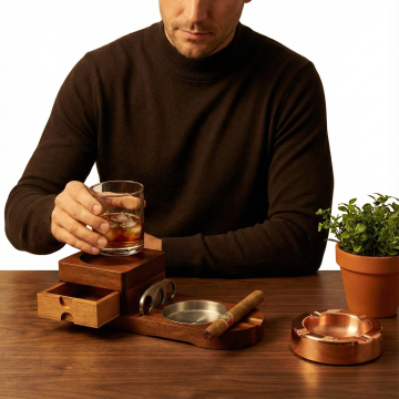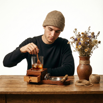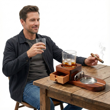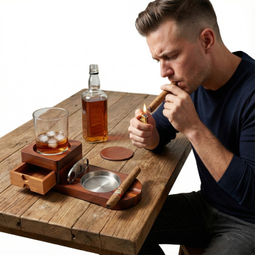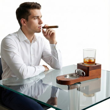 10张场景,白底背景,1:1,把这个产品放在桌子上,旁边坐着一个男生在喝酒或者在抽烟