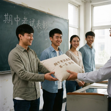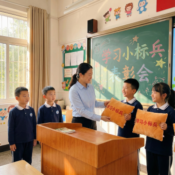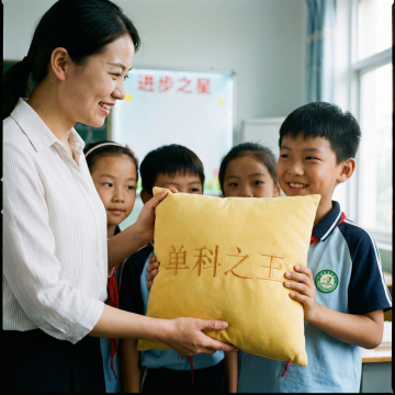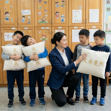 上面四个图是奖励给学生的枕头,用四张图生成场景,场景在小学学校教室讲台上,四名小学男学生在讲台上成一排站着(有两个同学已经拿到奖状枕头),看向旁边讲台上的一名资深教师,教师在颁奖状给学生(奖状为图中的枕头产品),保持产品一致,国内的学生和老师,场景氛围舒适,生成四张。