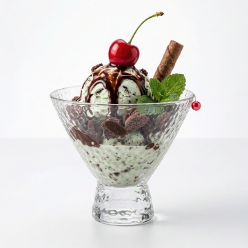 色彩鲜艳的写实风格冰淇淋球组合,透明雕花玻璃高脚杯盛放,三个不同口味的冰淇淋球堆叠:深棕色巧克力口味带细腻波纹,白色香草口味点缀黑色巧克力碎,浅棕色香草口味顶部装饰黑色几何图案巧克力片,右侧有螺旋状奶油,杯壁内侧底部有彩色水果丁(红色樱桃、黄色芒果块),两根棕色酥脆蛋筒斜插在冰淇淋球后方,整体光影明亮柔和,高光突出冰淇淋的丝滑质感和玻璃的透明光泽,色彩饱和度高且对比鲜明,构图饱满居中,背景为纯白色。