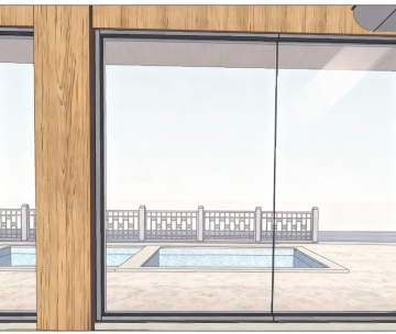 室内视角望向窗外的景观,清晨或黄昏柔和的金色阳光从左上角照射进来,在地板上投下窗框的阴影,大面积的落地窗,窗框为简约的金色,右侧垂落着米白色的厚重窗帘,窗外是开阔的城市与自然景观,远处有连绵的山脉,中间是平静的湖泊或河流,近处是错落有致的高楼与低矮建筑群,以及点缀其间的树木,整体画面呈现出温暖、宁静、开阔的氛围,光线柔和,色彩以金色、米白、淡蓝、浅灰为主,具有高度的写实感和清晰的细节,不同配色、不同角度的窗户设计,保持整体景观和光线氛围的一致性。