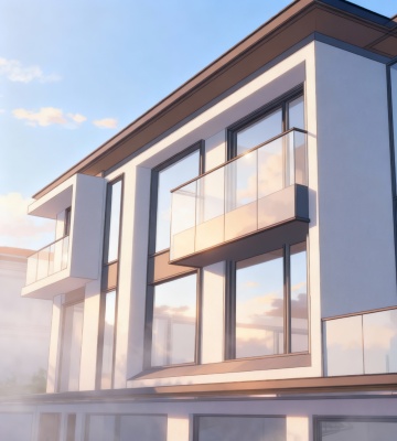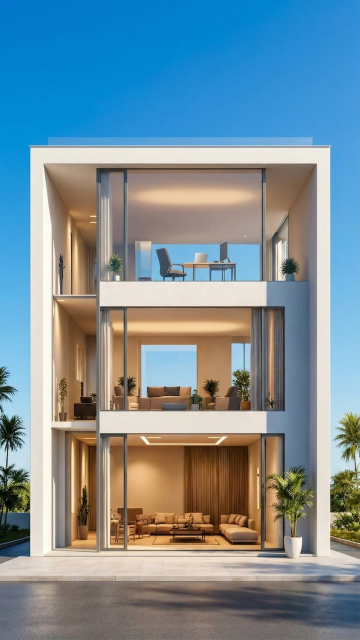 极简主义风格的现代别墅建筑,以纯净的白色为主色调,搭配大面积通透的落地玻璃窗,呈现出几何切割感的独特外观。别墅前方设有平静的水池,完美倒映建筑轮廓与天空云彩。建筑内部透出温暖柔和的灯光,与傍晚时分清澈的蓝色天空形成和谐对比。周围点缀少量绿色植被,增强自然氛围。整体设计注重线条的简洁与结构的力量感,光影层次丰富,营造出宁静、高端且富有未来感的居住空间。