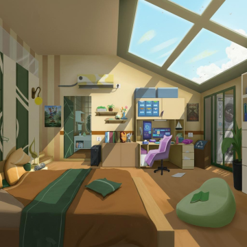 插画风卧室,融合卡通感与轻拟物设计,水彩质感渲染温馨氛围,天窗引入光影感,简约主义布局传递舒适与清新。