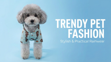 以图中的泰迪狗狗雨衣为元素,物体主体特征不变,设计4张跟泰迪狗狗雨衣有关的图,可以适当加一些英语文案点缀一下,比例 「16:9」