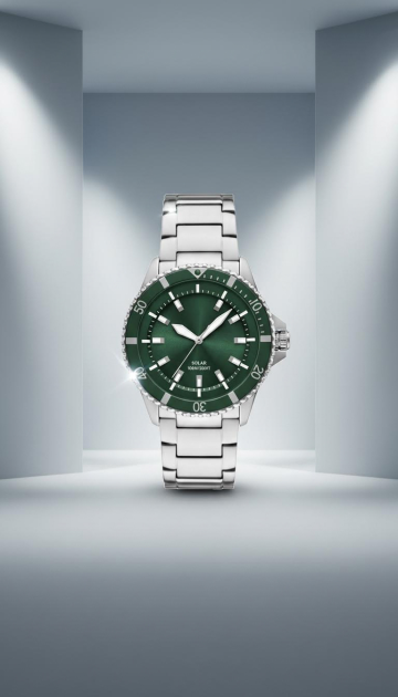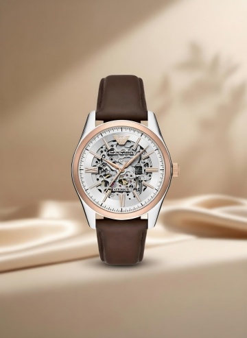 奢华感与优雅感交织,金属风表壳搭配皮质风表带,重拟物风礼盒呈现真实质感,浮雕风细节凸显精致工艺,节日氛围浓厚。