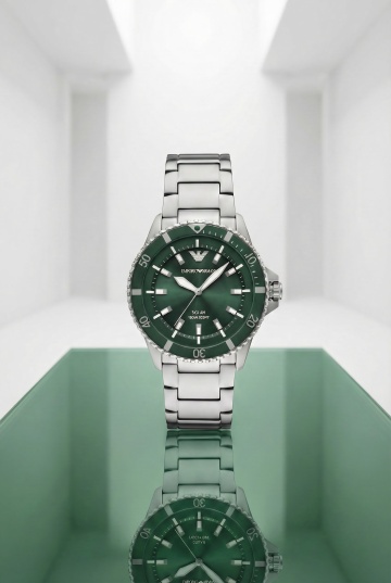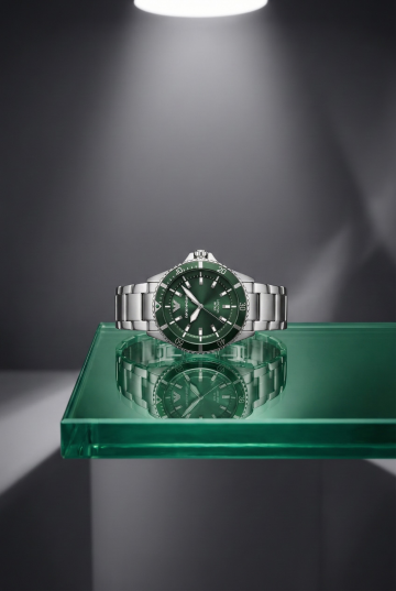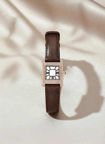 浅米色的丝绸做空间感的背景,珍珠般的光泽感,光线柔和,光线从左侧照射过来,手表右侧有阴影,手表平方在丝绸中,背景中非常浅的有两三片树叶的倒影