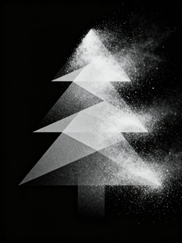 极简主义圣诞树,几何形与粒子光效交织,黑白单色中透出未来感与朦胧光影,抽象演绎节日静谧之美。