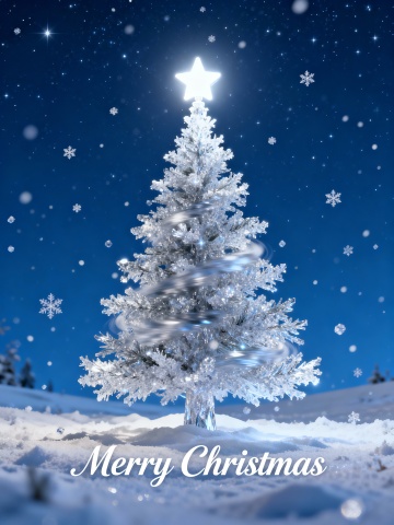 梦幻雪景中的3D浮雕圣诞树,重拟物风格呈现温馨光影,雪花覆盖的体积感与彩灯辉映,营造冬夜节日氛围。