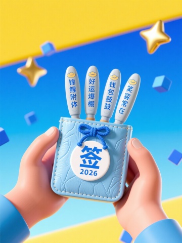 软3D风设计,卡通感十足的签筒与签条,搭配梦幻蓝黄渐变背景,清新喜庆,传递2026新年好运祝福。