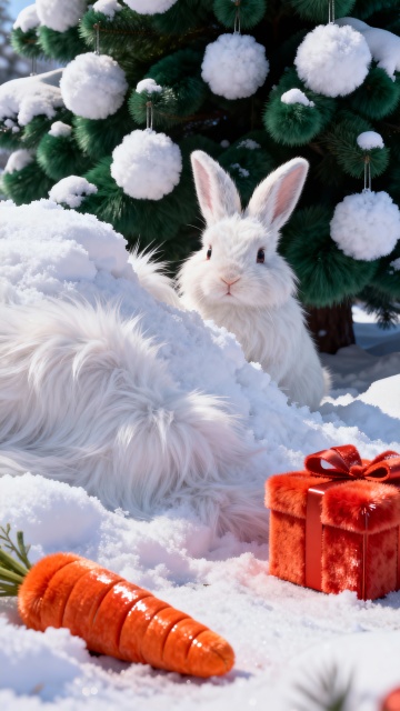 上宫格大特写镜头,浅灰色垂耳兔侧脸特写,焦糖色针织小围巾裹着圆滚滚的脖颈,柔软绒毛沾着细雪,黑亮的小鼻尖凝着雪粒,粉白小爪子轻搭在缀有红果刺绣的粗纺羊毛毯上,垂落的耳尖落着细碎雪花,围巾旁露出半截红色针织小袜子,袜子上绣着圣诞小花,光影柔和,凸显毛绒的蓬松质感。