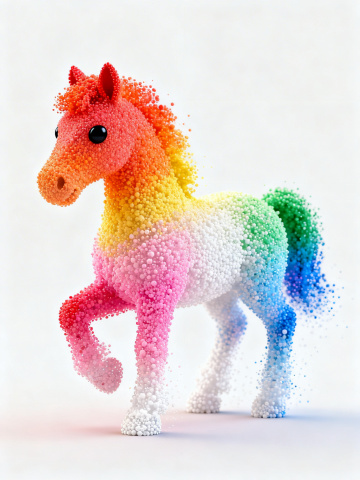 梦幻软3D风格,粉嫩毛发生长感小马跃动空中,彩虹鬃毛与童趣配饰交织,萌趣卡通设计,传递节日欢愉氛围。