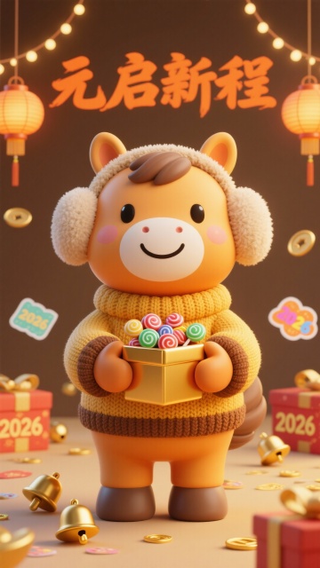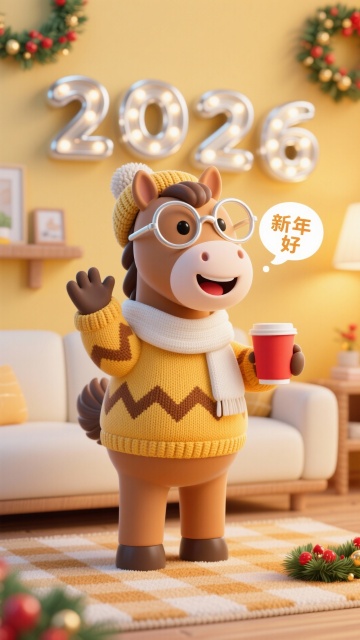 软3D风拟人马身着国潮汉服,手持灯笼与“元旦”卷轴,背景古建筑与梅花点缀,萌趣喜庆,传递新年祝福。
