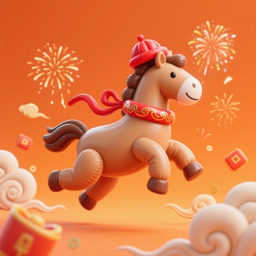 梦幻感十足的软3D风格红马,毛发生长细腻,卡通化设计萌趣可爱,云海环绕,虚拟现实氛围浓厚,节日喜庆气息扑面而来。