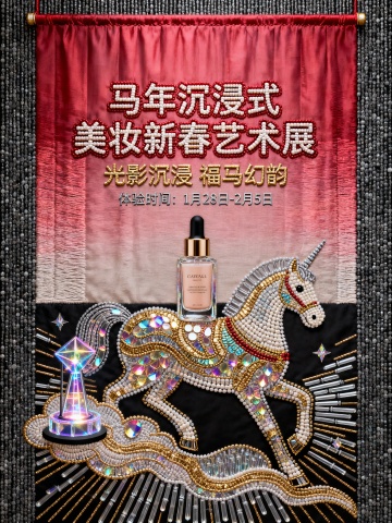 光影流转,国潮刺绣马身缀满珠光鳞片,鎏金金属风与极繁主义交织,营造梦幻奢华新春氛围,喜庆感十足。