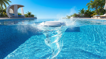 夏日泳池场景,高清晰度写实摄影风格,明亮阳光照射下的清澈蓝色池水,池壁由白色和深蓝色瓷砖铺砌,带有金属扶手的泳池阶梯部分浸入水中,水面波光粼粼并反射出耀眼的光斑,池边铺设浅棕色防滑地面,边缘点缀着色彩鲜艳的夏季花卉如粉色和黄色的绣球花,几只彩色充气游泳圈随意放置在池畔,远处可见白色遮阳伞和蓝白条纹的躺椅,营造出轻松愉快的夏日度假氛围,温暖的色调,清晰的光影对比,自然的阴影投射,整体画面充满夏日活力与清凉感。