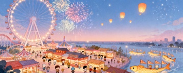 喜庆中式插画,刺绣风描绘欢庆场景,烟花映衬满月,人物舞动尽显节日氛围。