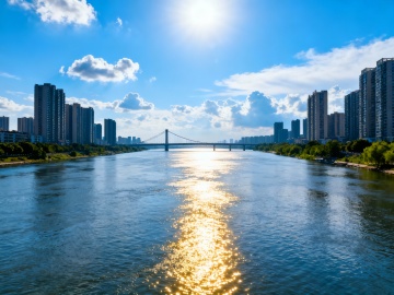 实景感中式古典建筑,city pop风光影交错,宽阔水面映衬浪漫夕阳,印象画派水彩风唯美景致。