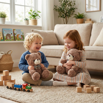 这是一个小狗窝,帮我生成一张图片。要求是小狗在使用的场景图,不能出现文字。小狗窝后有一美国小孩趴着观看的场景